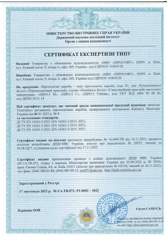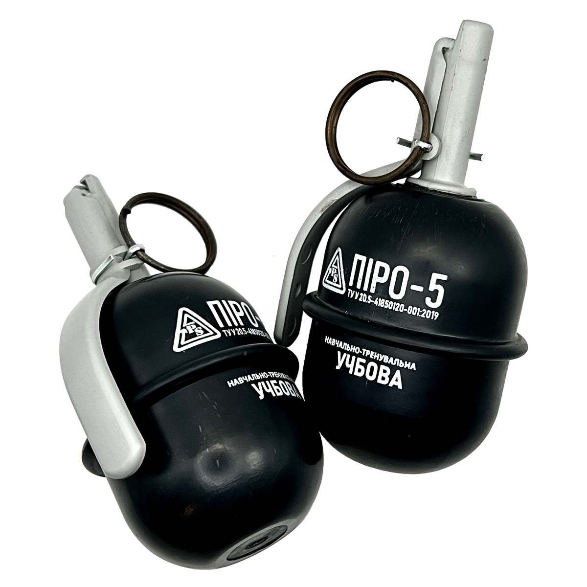 Граната ПІРО-5 Учбова. Розроблена під потреби військових та силових структур для навчань та відпрацювання вправ з гранатою типу РГД-5. Максимально реалістична учбово-тренувальна граната з піротехнічним ефектом категорії Р1. Вага у 310 грамів та розміри відповідають бойовому аналогу що дає можливість відпрацювання влучності та дальності кидка гранати. Використовується на спеціально відведених полігонах та майданчиках поза межами громадських місць.